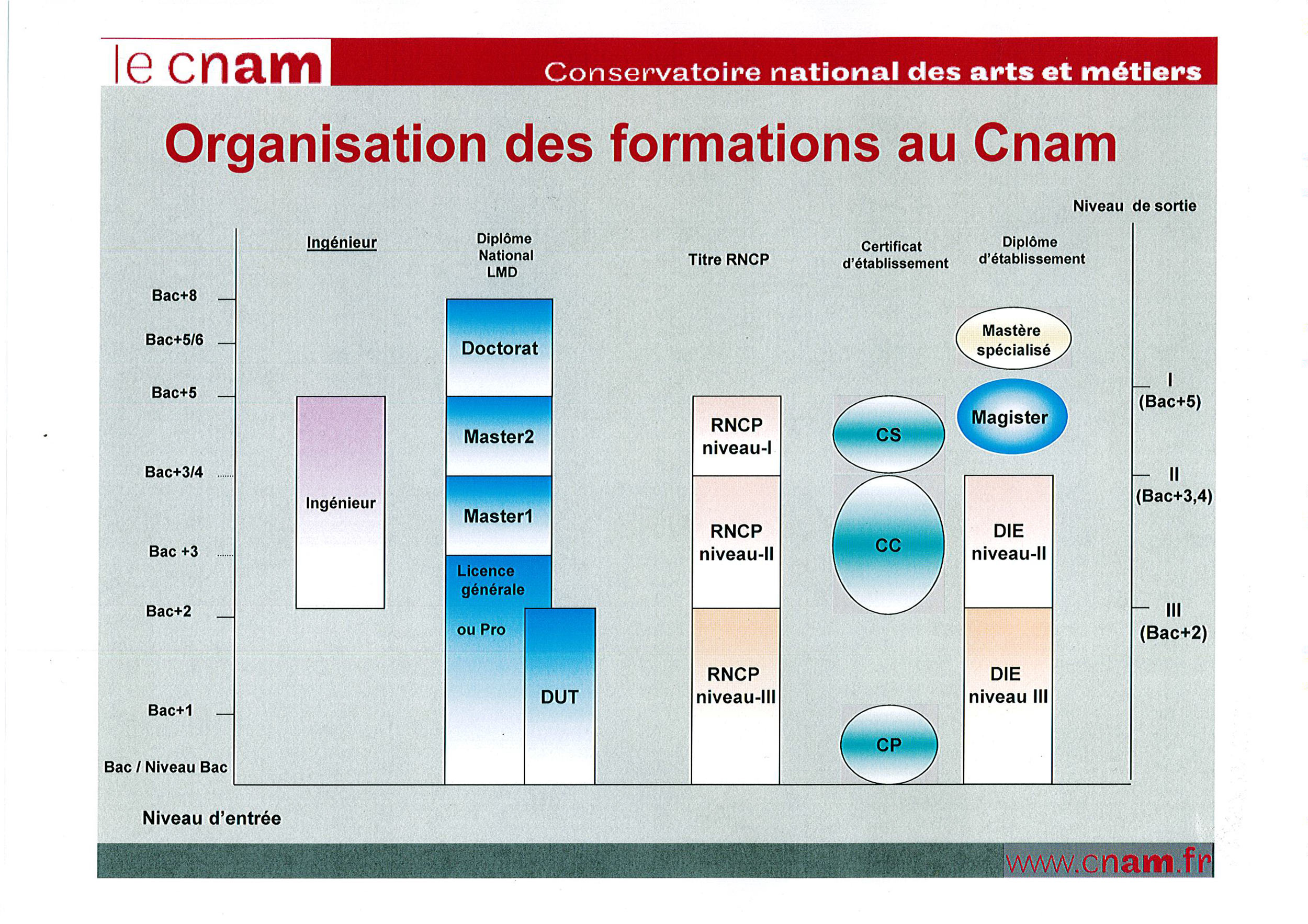 Les diplômes nationaux pour lesquels le Cnam a reçu une habilitation par le Ministère de l'Enseignement Supérieur et de la Recherche : Licences, Licences professionnelles, Master, Doctorats. Ces diplômes sont enregistrés de droit au Répertoire National des Certifications Professionnelles (RNCP).